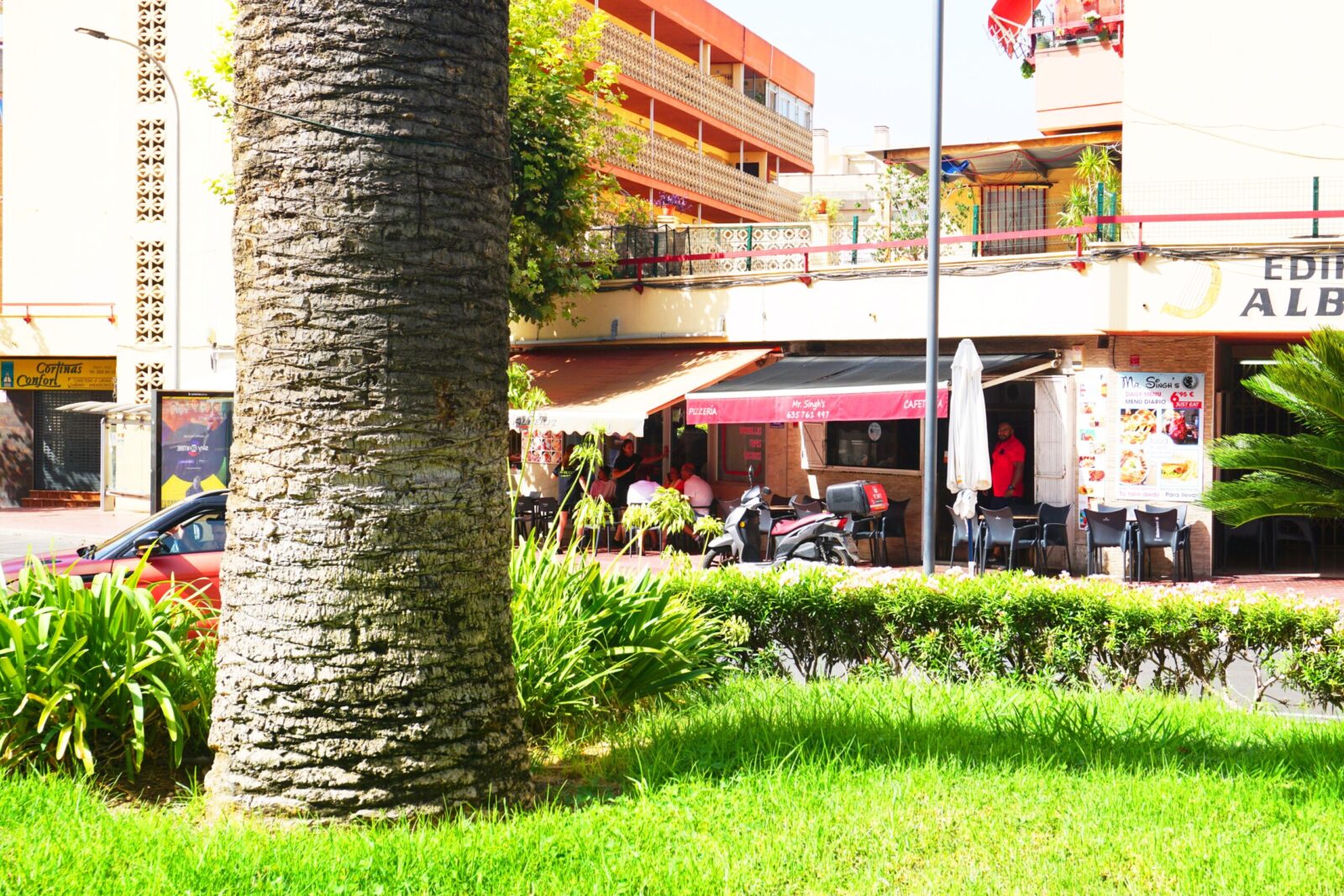 Pal Virk dukker opp, og tar plass ved bordet. Han er i godt humør etter å ha levert pizza på den norske skolen i Alfaz.